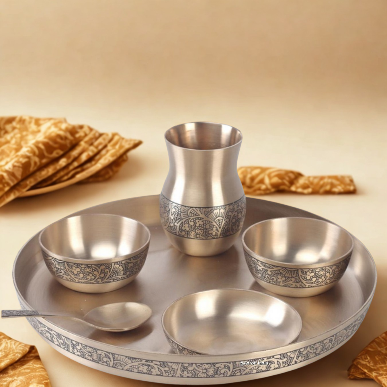 What makes this thali truly special is the intricate hand engraving, adding a royal touch that transforms every meal into a luxurious dining experience. The natural bronze composition is known for its Ayurvedic benefits, helping enhance digestion, balance acidity, and uplift overall wellness